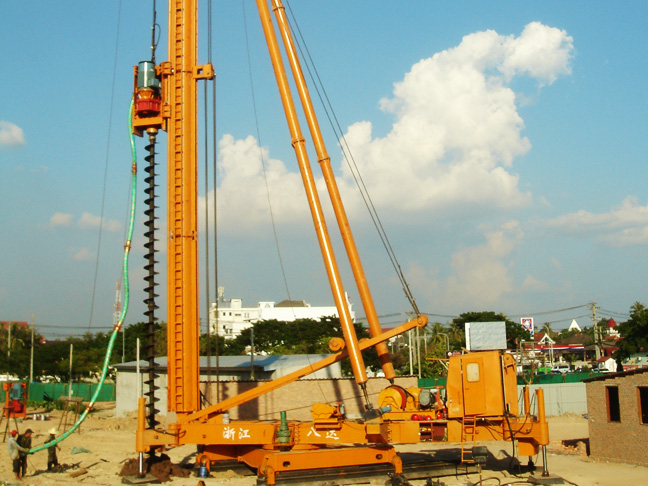 ZJB系列步履式長螺旋鉆孔機(jī)由液壓步履式多功能樁架和鉆進(jìn)系統(tǒng)兩個(gè)部分組成。樁架采用液壓步履式行走機(jī)構(gòu),自動(dòng)化程度高、可進(jìn)行正反180度回轉(zhuǎn),底部設(shè)有四條液壓支腿油缸及兩條行走油缸以輔助行走及回轉(zhuǎn),同時(shí)增加施工時(shí)的整機(jī)穩(wěn)定性。鉆進(jìn)系統(tǒng)包括動(dòng)力頭與鉆具,動(dòng)力頭的輸出軸與螺旋鉆具為中空式,打樁機(jī)采用長螺旋成孔,可通過鉆桿中心管將混凝土或泥漿進(jìn)行泵送混凝土CFG樁施工,即能鉆孔成樁一機(jī)一次完成。使用該機(jī)進(jìn)行鉆孔灌注樁作業(yè)時(shí),沉孔效率高、沉樁質(zhì)量好,對(duì)于穿透沙礫層效果遠(yuǎn)大于錘擊沉樁法,同時(shí)還有效避免了錘擊及振動(dòng)沉樁對(duì)地基擠壓而危及臨近建筑物的不良影響。